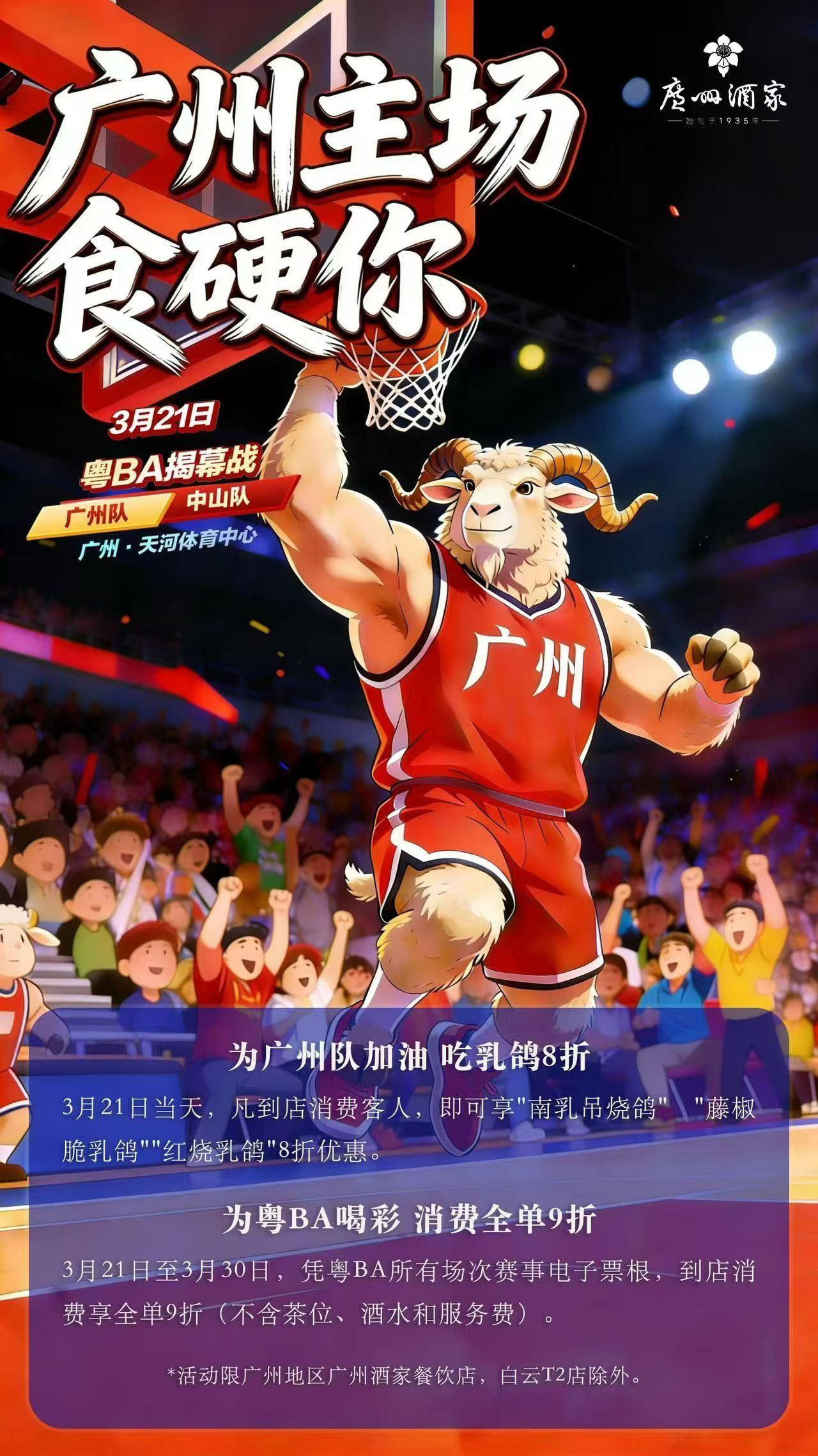 此外,3月21日-3月30日,凭粤BA所有场次赛事票根,到广州酒家(白云T2店除外)的广州所有门店消费,享全单9折。(优惠可与乳鸽折扣同享)