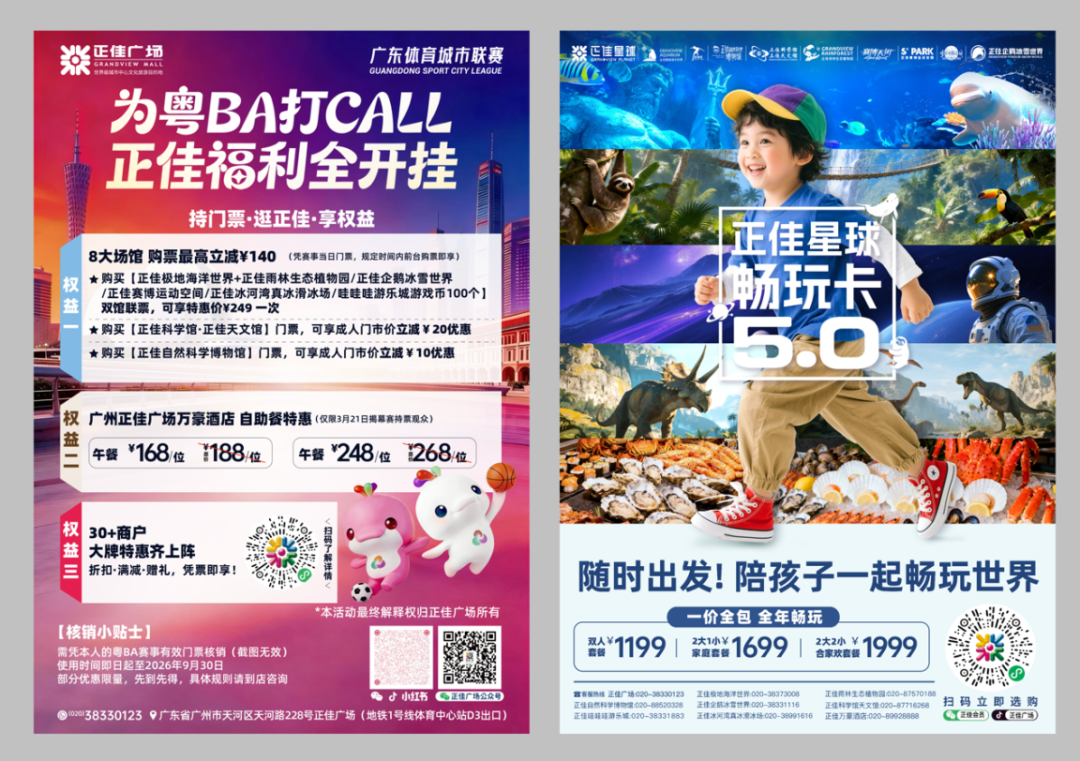 不只是吃!正佳广场推出粤BA特享权益,凭赛事当日门票可享8大场馆购票最高立减140元,揭幕战持票观众加享万豪酒店自助餐特惠,还有超30家场内商户提供多样折扣、满减及赠礼。
